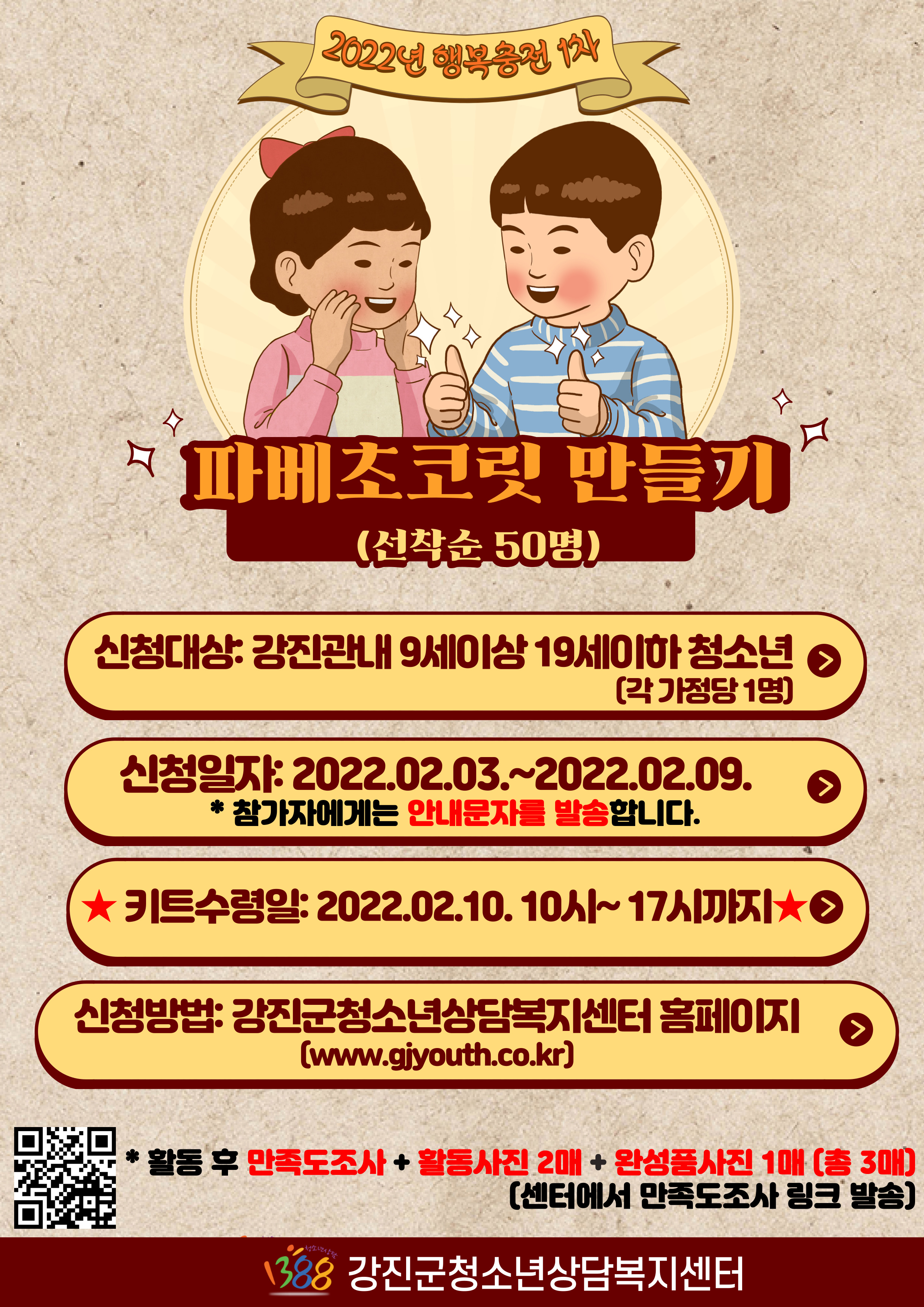 °Áø±ºÃ»¼Ò³â»ó´ãº¹Áö¼¾ÅÍ¿¡¼ "ÆÄº£ÃÊÄÚ·¿¸¸µé±â" ÇÁ·Î±×·¥À» ÁøÇàÇÕ´Ï´Ù.